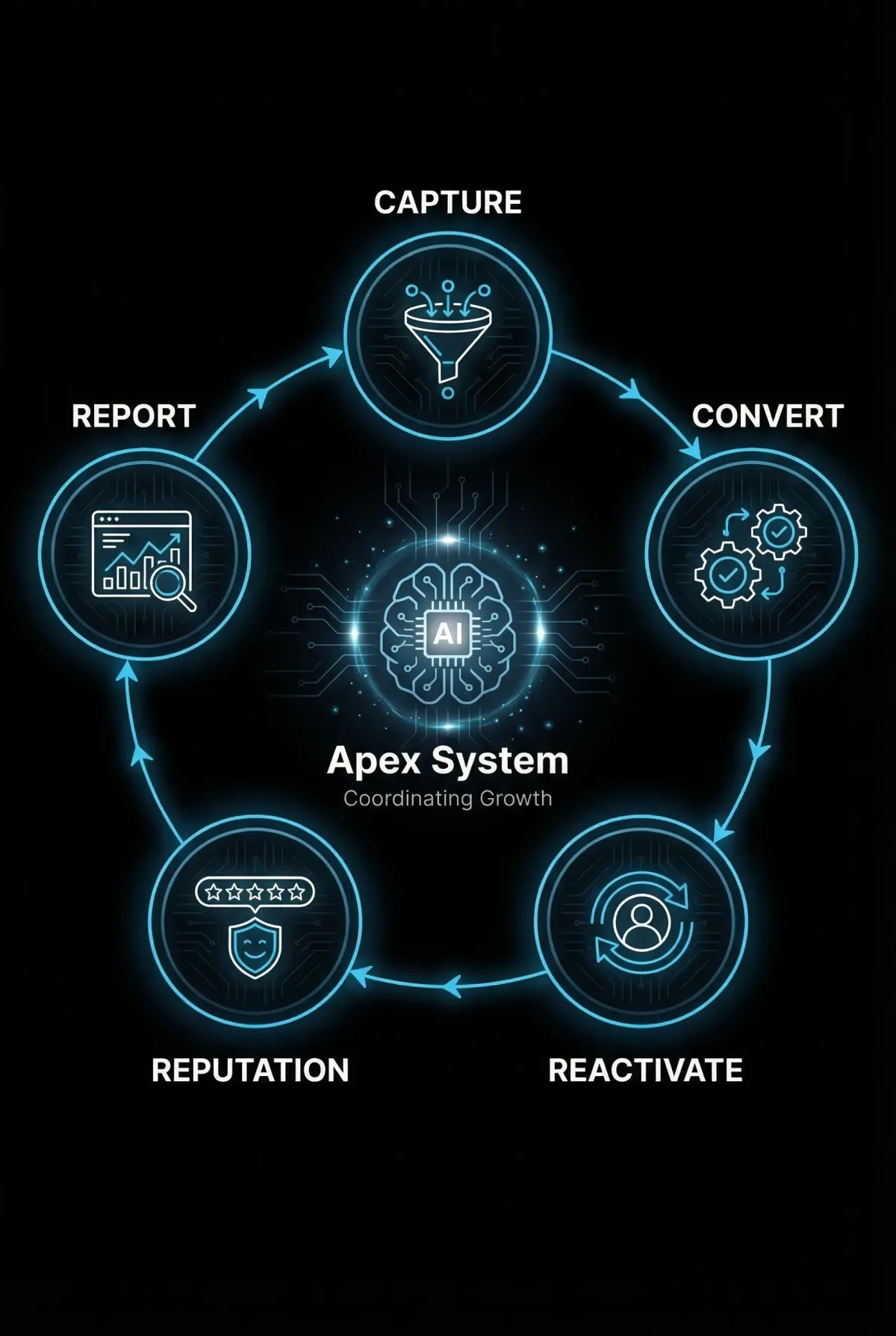 Apex is an AI-powered growth system that captures every lead, follows up instantly, reactivates old prospects, manages reviews, and turns more conversations into booked appointments.